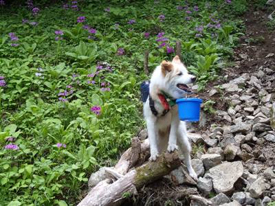 クリンソウと荷物を運ぶ賢いワンちゃん カタクリの花