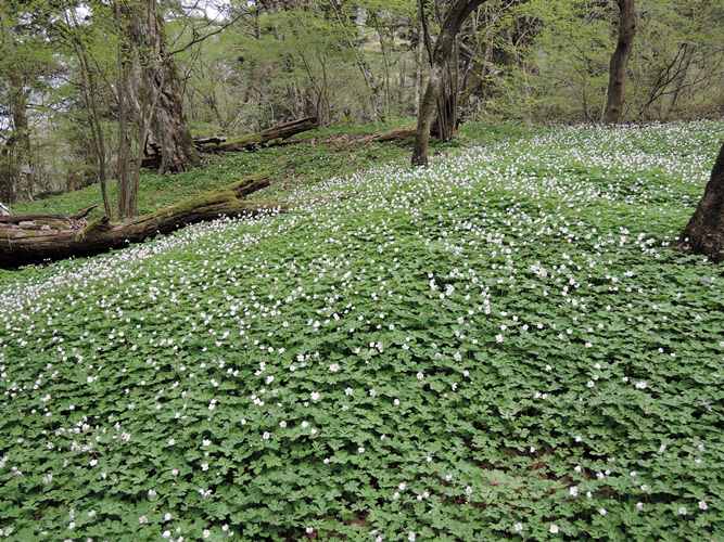 春、4月下旬から5月のはじめ 「カトラ谷」にニリンソウのお花畑が出現します。そして、ゴールデンウィークを過ぎると、白や紫のクリンソウの群落も見られるようになります。普段、静かな「カトラ谷」に人が押し寄せます。また、山頂付近(葛木神社の裏あたり)ではスプリング・エフェメラル「春の妖精」と呼ばれるカタクリの花も見られます。春は爽やかな花の季節。可憐な花と新緑が初々しいです。