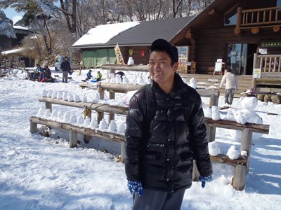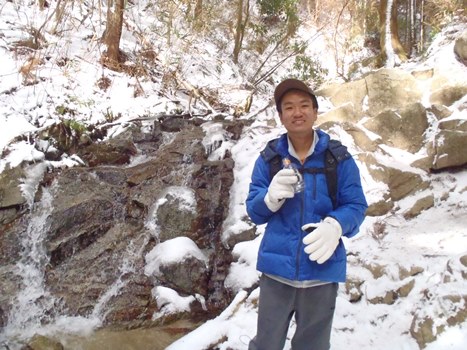 二ノ滝の前で記念写真 千早園地の広場で(うしろに小さな雪だるま)