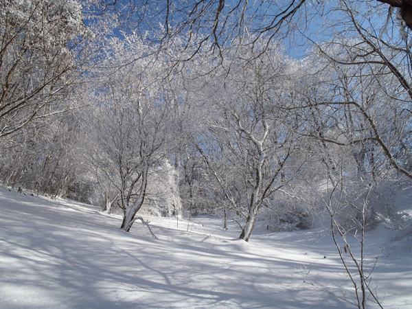 冬季、山頂付近のブナ林や落葉広葉樹林は、みな白銀の「霧氷」へと変身いたします。