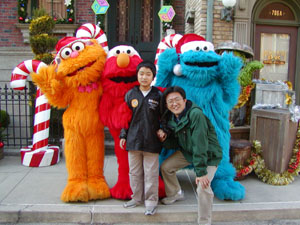 ふさふさのオバケ3匹と記念撮影。 「セサミストリート」です。 僕は、かぶり物のキャラクター大好きです。特にふさふさのやつ。思わず触りたくなります。 エルモは僕の友だちです。 |