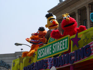 | 「セサミストリート」のバスがやってきた! この後、道端でダンスパーティーが行なわれます。お兄さんもお姉さんもとてもダンスが上手。 音楽に乗って、僕もウキウキです。 このショーは並ばなくてもいいし、いつも見に行ってました。 |