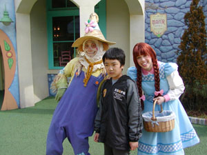 | ドロシーちゃんと案山子のおばけと記念撮影。 ドロシーちゃんは笑顔が素敵です。 三つ編みをひっぱってみたいですね。 でも大丈夫、がまんしていました。 僕はシャイなんです。 |