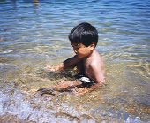 はじめての海水浴 波がざわざわ、おもしろいぞ〜。 |