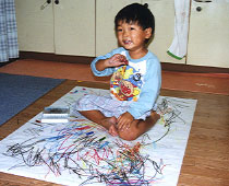 秋 クレヨンで絵(?)を描きまくる俊クン。 小さな紙だとすぐにはみ出すので、大きな模造紙に描かせています。徐々に筆圧も強く、しっかりとした線がひけるようになってきました。 「どんなもんだい」という風な自慢げな表情です。 |