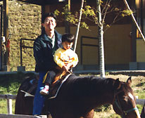 | 12月 堺市にある緑のミュージアム「ハーベストの丘」で初めてお馬さんに乗りました。 この公園は、手作りの食べ物や、クラフト工芸、動物とのふれあいなどを体験できるところです。 右の乗馬は、親子乗り1周700円、ポニーだと400円、ちょっとだけなので掴まってさえいれば大丈夫、自慢話のネタにいかがでしょう? |