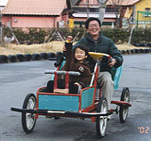 おもしろ自転車 寒い寒い冬、おもしろ自転車にトライ!俊くん以上にはりきるパパ。この直後、雪がたくさん降ってきて、雪の中を二人で駆け抜けました。俊くんは寒くてもへっちゃらです。 |