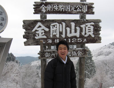 今日は僕の13歳の誕生日。 今年も金剛山にやってきました。年末からつづく寒波で、山の上は真っ白。2年連続正月に樹氷が見られました。 いつもは金剛山といえば、ロープウェイを使って、「ちはや園地」に行き、そこから山頂の遊歩道を回る楽チンコースをとっていたのですが、今回は麓の登山口から、千早本道を経て山頂に出る、本格登山コース。 登山道はよく整備されているのですが、やはり階段が多くひたすら登りです。でも、俊君はへっちゃら、らくらくと5合目まで登り、7合目あたりからちらほら雪が見られ、8合目を過ぎると、あたり一面雪景色です。2時間ほどで山頂(国見台)に到着しました。 |
