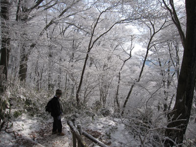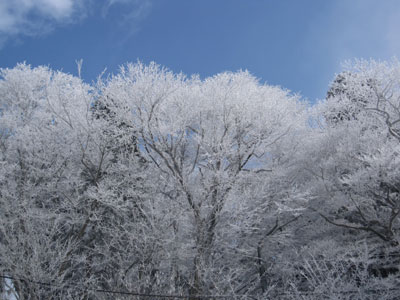 金剛山は、大衆登山の『聖地』と言われています。 「錬成会」に入って、毎朝のように登っておられる方もいますし、中には何百回とか、千回を超えておられる方もいます。 いちおう俊君は「銀バッチ」を持っています。 金剛山の山頂付近は、ブナやナラの広葉樹が多く、落葉したあとの小枝に、霧氷がついて白い氷の花が咲いたようです。陽が差すと宝石のように輝きます。 青空とのコントラストがとてもきれいです。 |