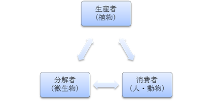 生態系・・・つながり合って存在している。「共生」、支え合いのシステム。 自然界には食物連鎖や競争、寄生、敵対などいろいろな関係がみられるが、より大きな視点から見れば、絶妙なバランスを保ちながら「共生」しているということ。 中でも、分解者である微生物の役割は重要であり、土壌環境は守らなくてはいけない。(今まで見過ごされることが多かった)不耕起栽培の大切な意味は、土壌環境を守ることにあり、そこから新しい生命が出発する(生命活動の土台) 生態系は川や池、小さな畑の中にも存在する。その典型的な形が「森林生態系」であり、そこから私たちは多くのことを学ぶことができる。 人間にとっては、人と人とのつながり、いろんな生き物との繋がり、自然環境との繋がり、つまりは「地球」という生態系の中でのつながりが大切なのである。