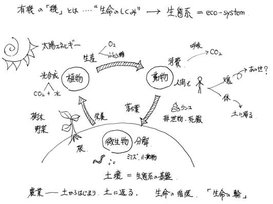 日本の森林における生態系や、有機栽培で実現しようとしている生態系は、植物(生産)・動物(消費)・微生物(分解)というそれぞれ役割を担う生命体と、それをとりまく環境全体を指し、そのつながりと循環による共生・共存、一つの持続的な生命の共同体のことを言っています。それは、小さなビオトープから、畑、地球全体にも拡大して解釈することが可能です。