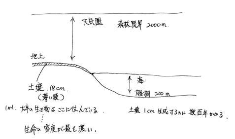 しかし、土壌と呼ばれる地中の生命域は、陸地の面積で平均すると、わずか18cmしかないそうです。しかしながら、生命の大半は地球を取り巻くその薄い膜の中に住んでいるのです。そして多くの生き物は、土壌の生産力に依存しているのです。